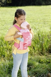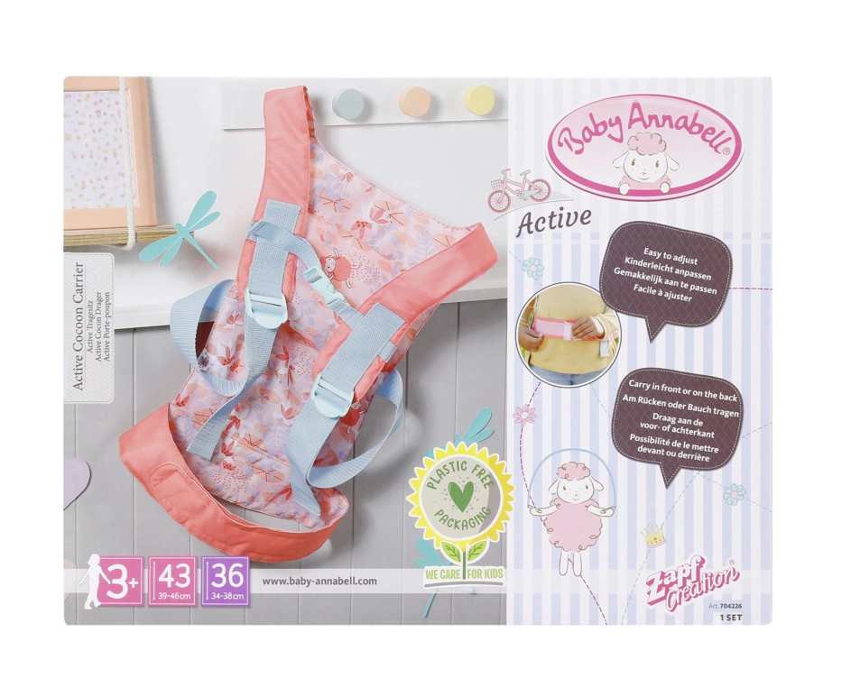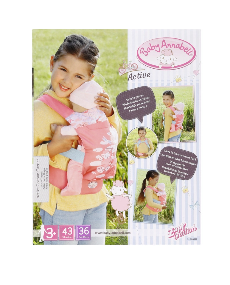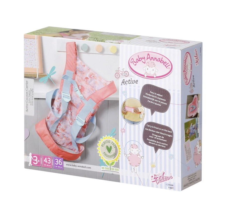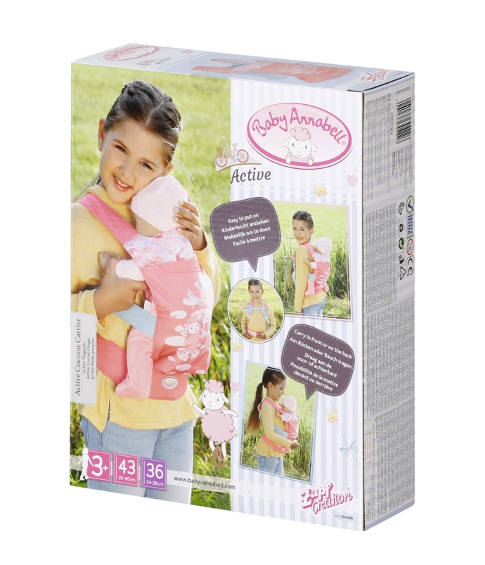 A praktikus BABY ANNABELL babahordozó nagyszerű a kis gondoskodóknak, akik szeretnék, ha babájuk mindig velük lenne. Az elöl és háton való hordozási lehetőségeknek, valamint a két elülső ülőpozíciónak (előre nézve vagy a gyermek felé fordítva) köszönhetően a gyerekek minden kiránduláson kényelmesen és biztonságosan játszhatnak.