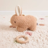 A nyuszi puha poliészter plüssből készült, kényelmes a kis kezekben, és könnyen tisztán tartható. A textil huroknak köszönhetően a játék gyorsan és biztonságosan rögzíthető a kiságyra, babakocsira vagy autósülésre. A fa gyűrű a szerkezet felhúzására szolgál, és könnyen megfogható fogantyúként is működik az apró ujjacskáknak.