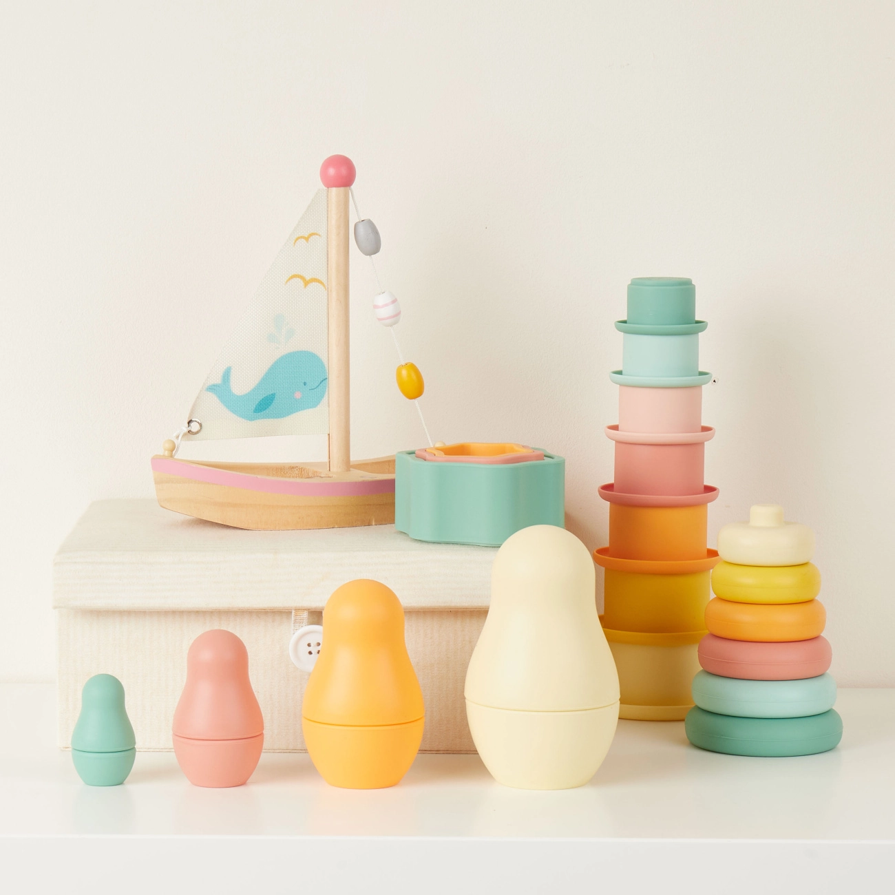 Fedezze fel a klasszikus játék modern változatát: a Tropical Vibes dizájnú szilikon összerakható matrjoska támogatja a finommotorikát, a logikus gondolkodást és a kreativitást. A 100% szilikonnak köszönhetően puha, törésálló és teljesen gyermekbiztonságos. Könnyen tisztítható, és tökéletesen illeszkedik a kisgyermekek kezébe.