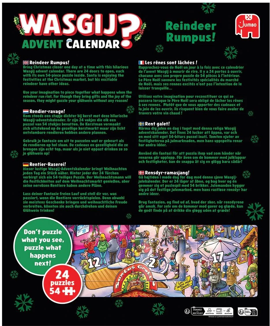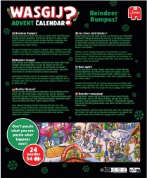 Tegye még szórakoztatóbbá a várakozást Szentestére a WASGIJ adventi naptárral: Megvadult rénszarvasok! Ez a naptár egyedülálló koncepciót kínál, ahol a kész kép nem egyezik meg a dobozon láthatóval. Nyomokat keres, beindítja a fantáziáját, és a jelenetet egy másik nézőpontból rakja ki. Ideális ajándék kirakórajongóknak és tapasztalt puzzlereknek, akik valami újat szeretnének.