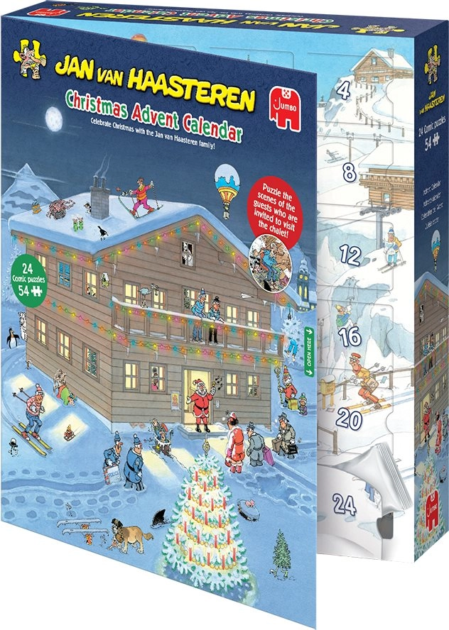 Fedezze fel az ünnepi szórakozást a JUMBO adventi naptárral, JAN VAN HAASTEREN illusztrátor alkotásaival. Minden nap nyisson ki egy új ablakot egy eredeti mini kirakóval, 54 darabbal, és rakjon ki 24 különböző képet, tele humorral és részletekkel. Egy kirakó mérete körülbelül 16,5 × 11,5 cm.