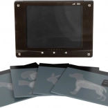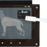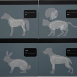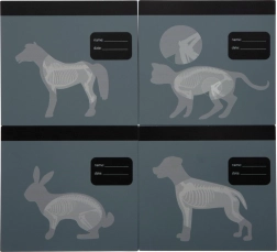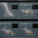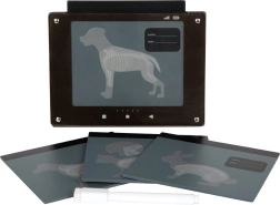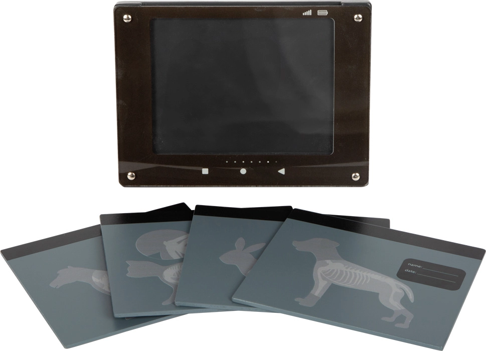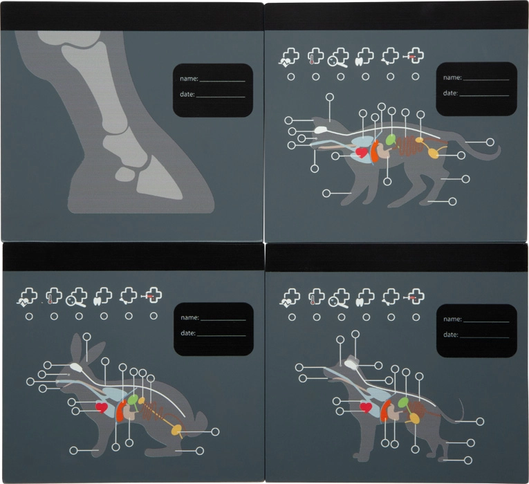 Interaktív „röntgen” átlátszó állatkártyákkal (kutya, macska, nyúl, ló), amely támogatja a képzelőerőt és játékosan mutatja be a test felépítését. A jegyzetmezőbe beírható a páciens neve és a vizsgálat dátuma.