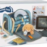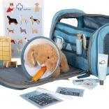 A praktikus táska nyuszihordozóként és az összes eszköz rendezőjeként funkcionál. Áttekinthető zsebeivel és cipzárral mindennek megvan a helye, készen a vizsgálatra. A készlet minőségi anyagokból (plüss, fa, textil, papír, műanyag) készült, és kisgyermekek kezéhez tervezett, könnyen megfogható elemeket tartalmaz.