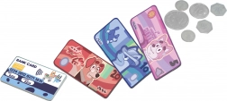 A szett papír bankjegyeket, műanyag érméket és bankkártyát tartalmaz, amelyekkel a gyerekek kipróbálhatják a készpénzes és kártyás fizetést.