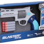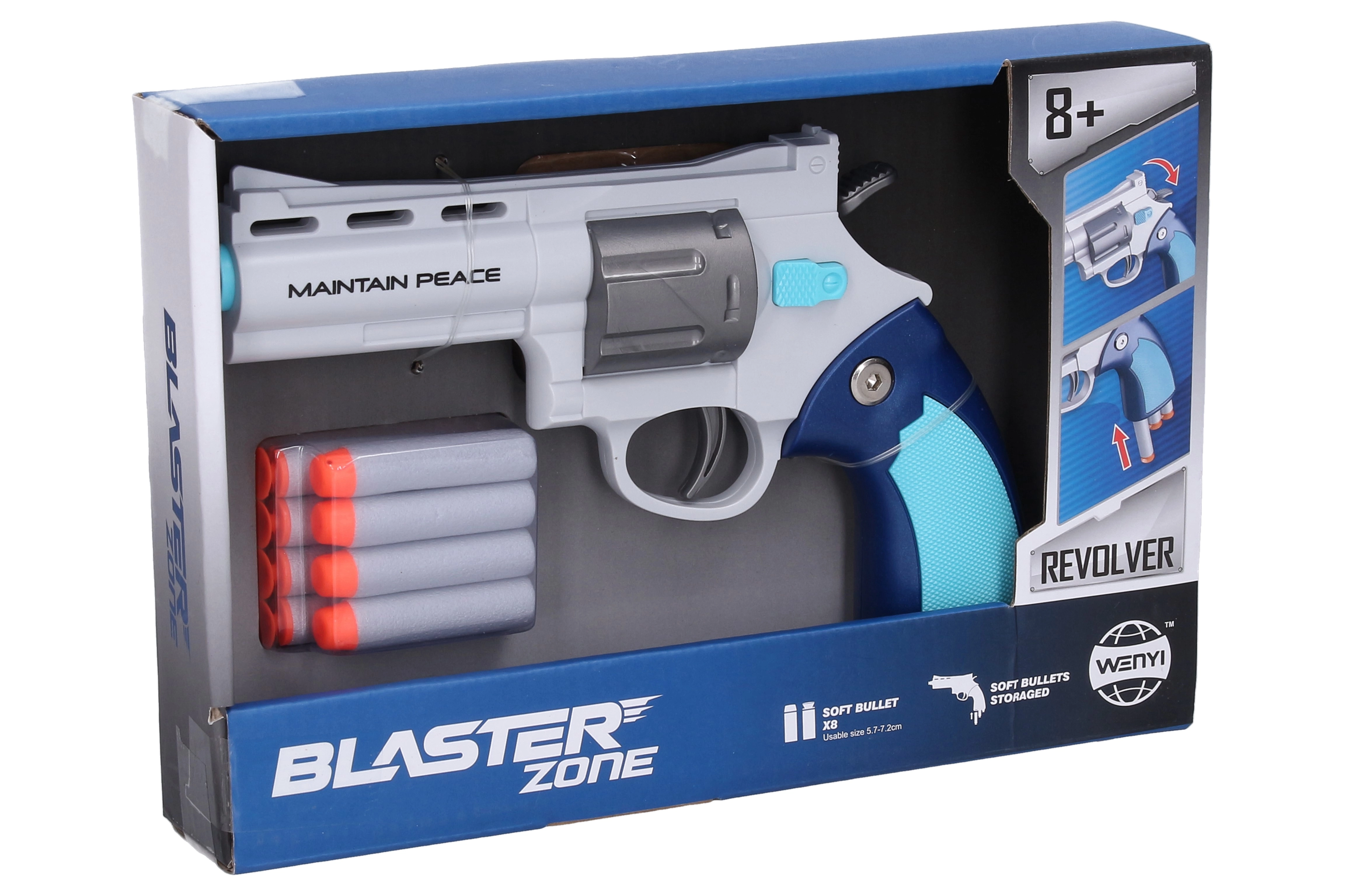 Szórakoztató és biztonságos lövöldözős játék 22,5 cm hosszú habos revolverrel. A csomag tartalmaz 8 hablövedéket (4 standard és 4 tapadókorongos) különböző játékokhoz. Egyszerű kezelés – helyezd a lövedéket a csőbe, húzd meg a kakast, majd húzd meg a ravaszt. Praktikus lövedéktartó felület a markolat alsó részén.