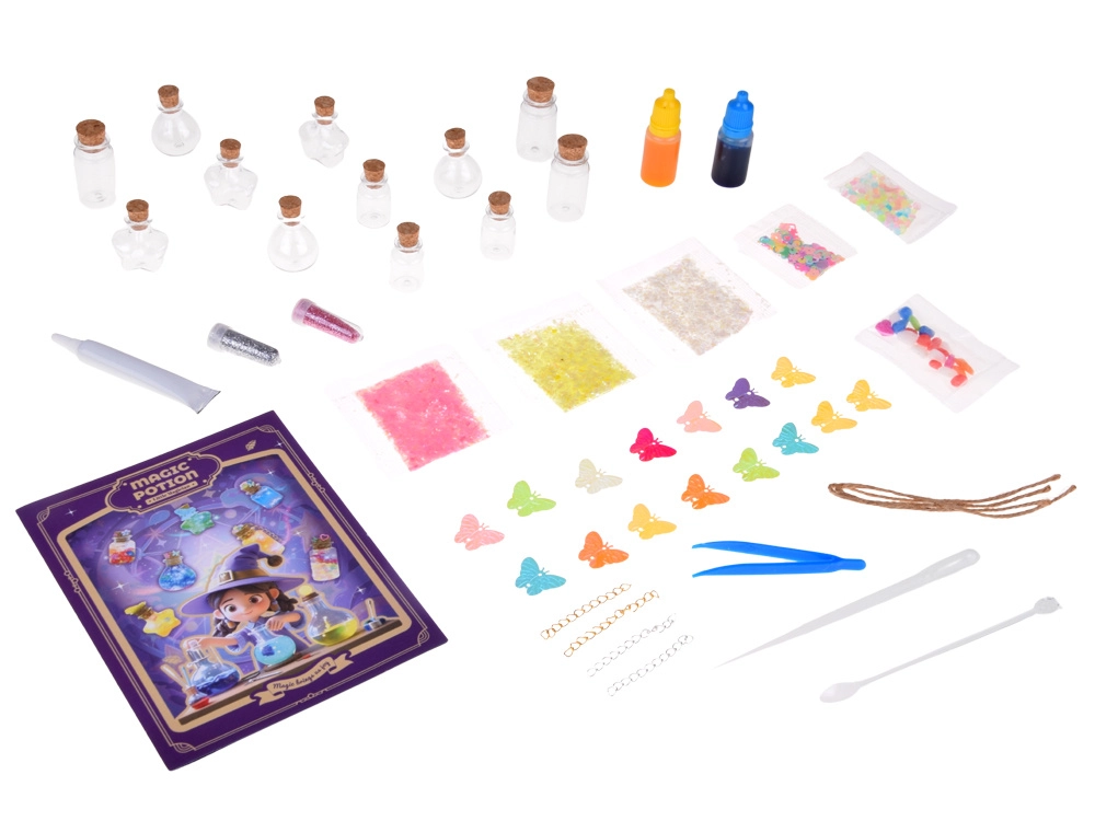 Fedezd fel, milyen egyszerű és szórakoztató saját dekoratív főzeteket készíteni! Ez a kreatív készlet gyerekeknek mini üvegcséket parafadugóval, csillámokat, pigmenteket, flitter díszeket, pillangó medálokat és praktikus eszközöket tartalmaz a pontos adagoláshoz. A gyerekek fejlesztik finommotorikájukat, kreativitásukat és fantáziájukat a színek keverése, a töltés és a varázsitalok díszítése közben.
