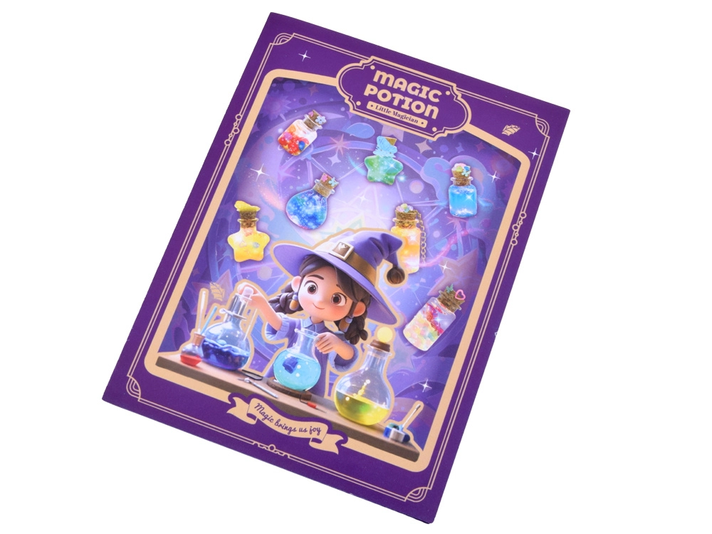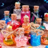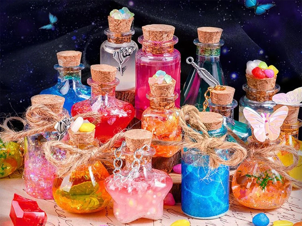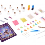 A „varázsital-készítő” szett minden ötletet csillogó mini alkotássá változtat. Szórj csillámokat és díszeket az üvegcsébe, adj hozzá pigmentes vizet, zárd le parafadugóval, és díszítsd medálokkal. Az eredmény lehet medál, talizmán vagy aranyos szobadekor.