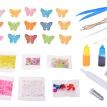 - Komplett készlet – 12 különböző formájú mini üvegcse, csillámok, pigmentek, díszek, eszközök.