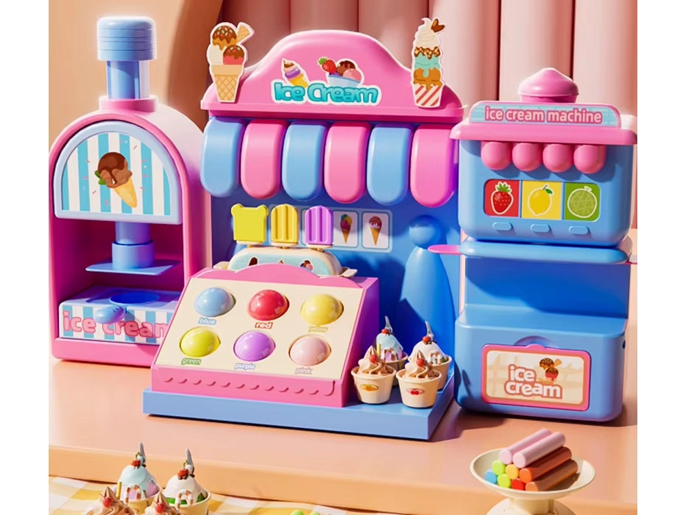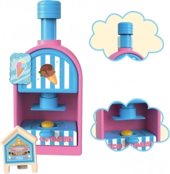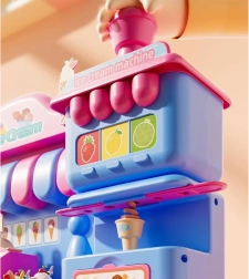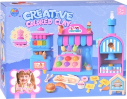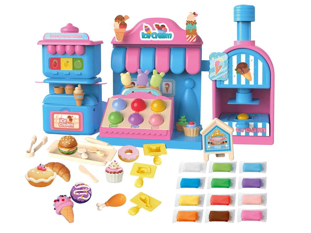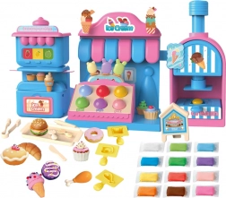 A komplex játékszett tartalmaz egy fagyigépet a színes adagok kinyomásához, egy pultot a finomságok kiállításához, valamint egy présformát „sütő” betéttel sütik és kekszek formázásához. Minden elem a rózsaszín és kék finom árnyalataiban készült, hogy az alkotások úgy nézzenek ki, mint egy valódi cukrászda vitrínjében.