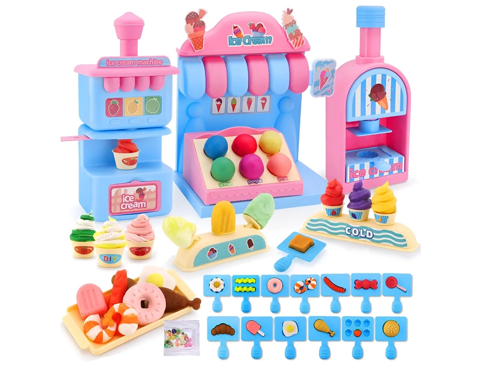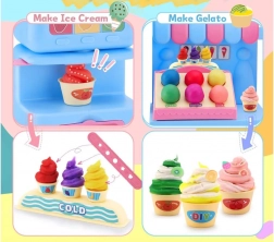 A szett gazdag felszereléssel érkezik – 12 tégely gyurma különböző színekben, formák és eszközök, továbbá poharak, tölcsérek és pálcikák jégkrémhez. A gyerekek „süthetnek” tortát, formázhatnak gyümölcsöt, készíthetnek bagettet vagy kinyomhatnak spirálfagyit.