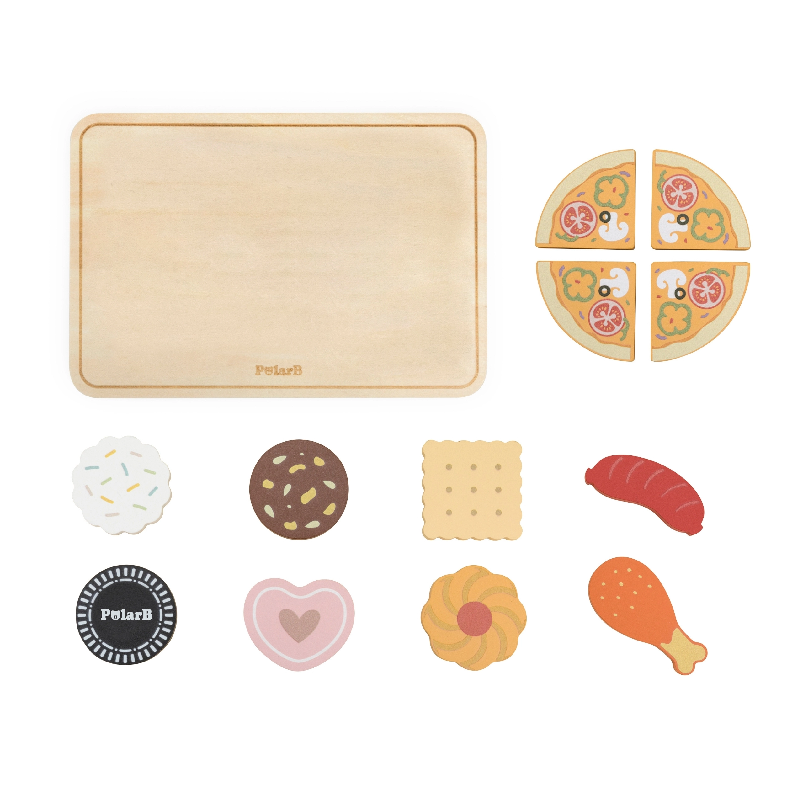 A csomag tartalma: tepsi, 6 különböző alakú keksz, 4 részes mini pizza, virsli és csirkecomb – minden készen áll a tálalásra.