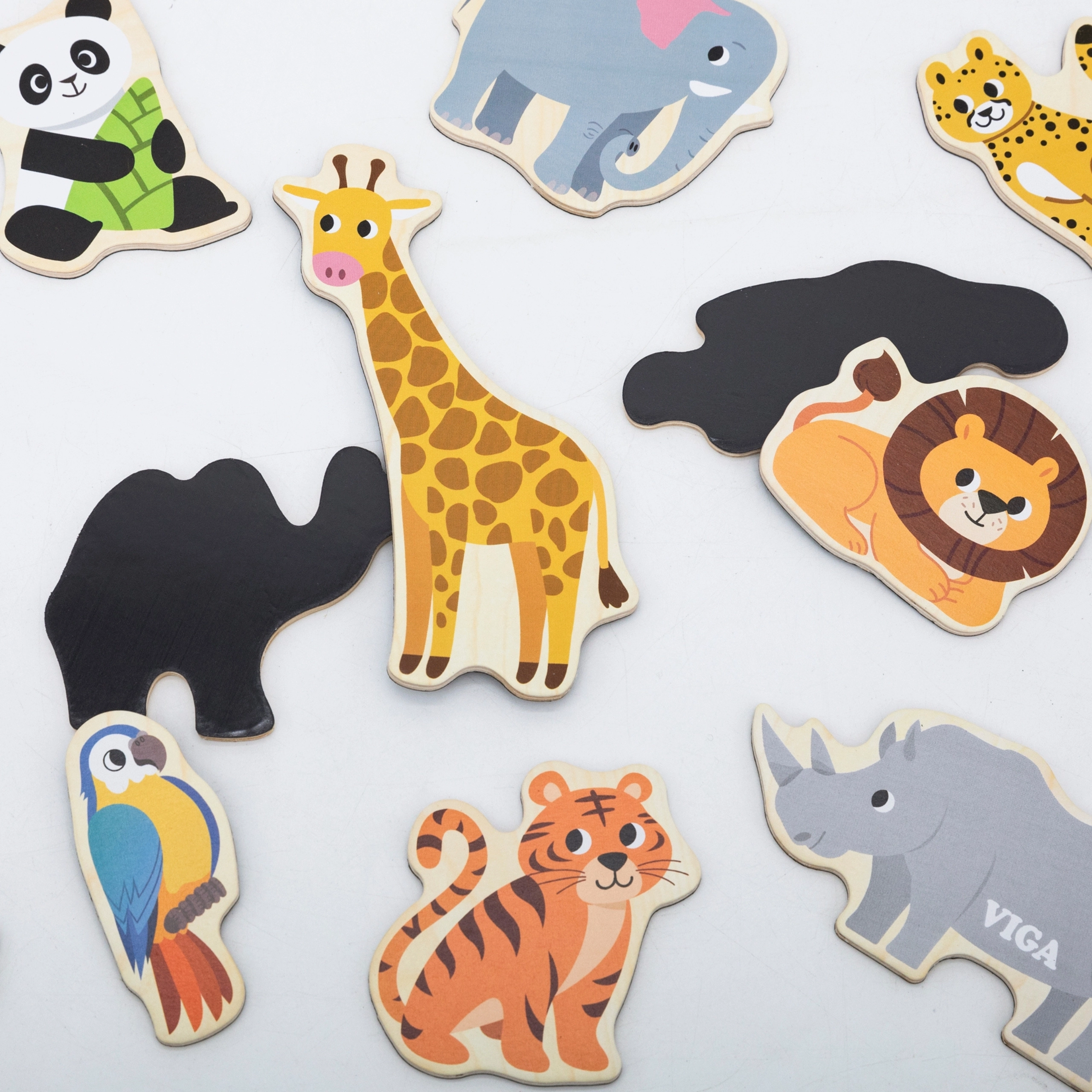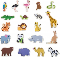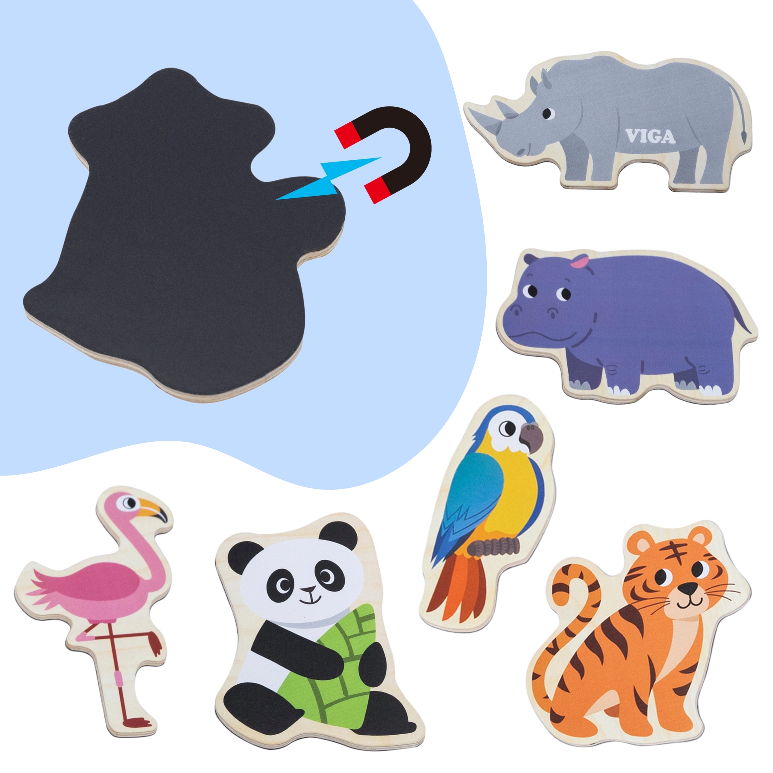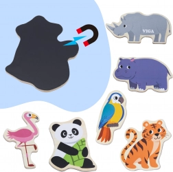 A VIGA – Vadállatok fa mágneskészlet vidám és edukatív szórakozást nyújt. A valósághűen illusztrált darabok, mint az oroszlán, zsiráf, krokodil vagy papagáj, beszélgetésre, a világ felfedezésére és első történetek alkotására ösztönöznek. A erős mágneses rétegnek köszönhetően stabilan tapadnak a hűtőre, mágneses táblára és más fém felületekre.