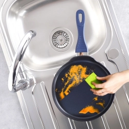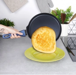 A puha szilikon felületű nyél hűvös marad és kényelmes fogást nyújt. Az alacsony perem megkönnyíti a tészta öntését, az aláemelést és a palacsinták megfordítását. A serpenyő PFOA- és PTFE-mentes, ellenálló a tisztítószerekkel szemben, és az indukciós talpnak köszönhetően minden főzőfelülettel kompatibilis.