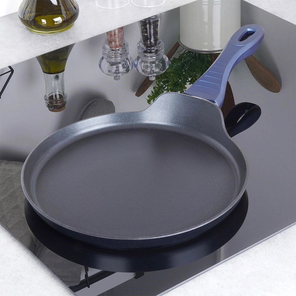 Ez a stílusos palacsintasütő tökéletesen vékony palacsintákhoz, amerikai palacsintához és omlettekhez készült. A gyémántszemcsés kerámia alap kiváló hővezetést biztosít, és egyenletes sütést tesz lehetővé odatapadás nélkül, így minimális olaj is elegendő. A masszív öntött alumínium kiválóan felhalmozza a hőt, és stabil hőmérsékletet tart a teljes felületen.