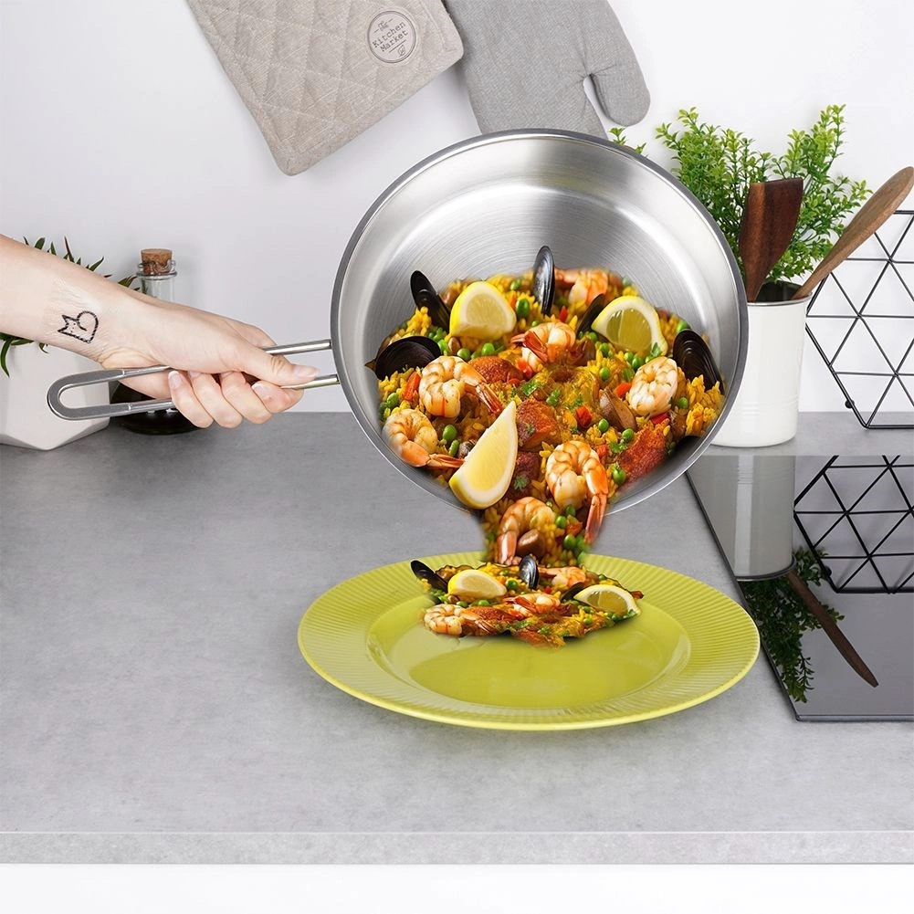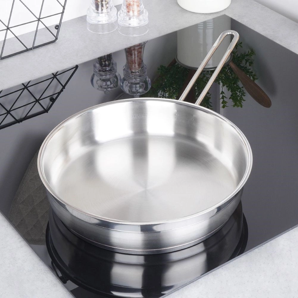 Ez az időtlen megjelenésű rozsdamentes acél serpenyő kiváló választás húsok, zöldségek és palacsinták készítéséhez is. Minőségi rozsdamentes acélból készült matt felülettel és elegáns, fényes felső díszcsíkkal, hosszú élettartamot és korrózióállóságot biztosít. A masszív falak és a stabil felépítés egyenletes hőeloszlást és megbízható teljesítményt garantál sütésnél és pirításnál.