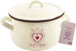 Elegáns zománcozott fazék fedővel és kényelmes fogantyúkkal a mindennapi főzéshez. Űrtartalma 2,3 l, átmérője 16 cm, és alkalmas minden típusú tűzhelyhez, beleértve az indukcióst is. Egészségre ártalmatlan zománcozott acél krémszínben szívmintával, könnyű karbantartás és mosogatógépben mosható.