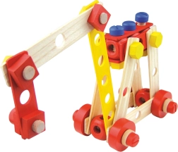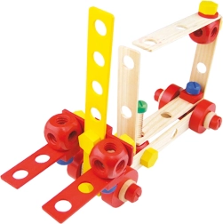 Színes és natúr lécek, csavarok, anyák, kerekek és csatlakozók segítségével a gyerekek járműveket és fantáziadús szerkezeteket állíthatnak össze, majd újra és újra átépíthetik őket.