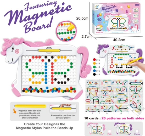 Ez a bájos, unikornis mintás mágneses tábla remek eszköz az első rajzokhoz és a finommotorika gyakorlásához. A gyerekek a mágneses tollal formákat, képeket és mintákat hozhatnak létre, amelyeket bármikor könnyen letörölhetnek és újrakezdhetnek. A sablonoknak köszönhetően a rajzolás még szórakoztatóbb és intuitívabb.