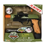 Valósághű megjelenésű műanyag pisztoly kis akciójáték-rajongóknak. Kínál fényhatásokat, hanghatásokat és praktikus kiegészítőket, mint célzó, zseblámpa és hangtompító. Elemmel működik, az elemek a csomag részét képezik.