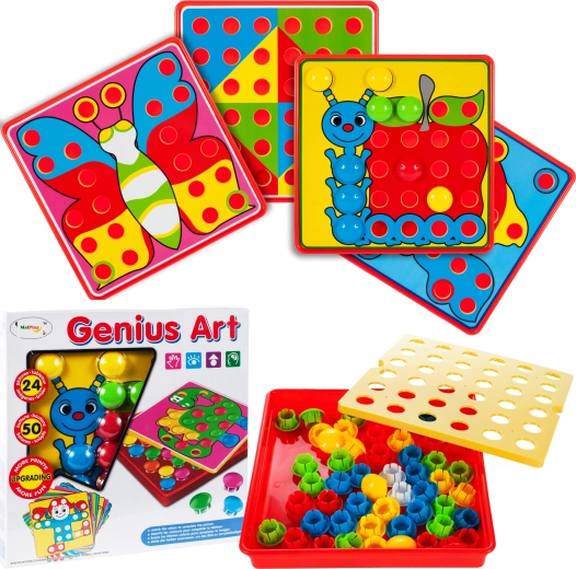 A kreatív, színes „gombokkal” kirakható mozaik örömet okoz a kis alkotóknak. A gyerekek fejlesztik a finommotorikát, a színfelismerést és a türelmet, miközben katicás és más mintájú képeket raknak ki. A csomag tartalma: 50 gomb, 24 sablon és egy praktikus tárolódoboz.