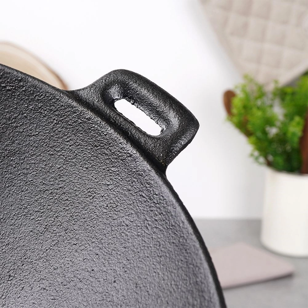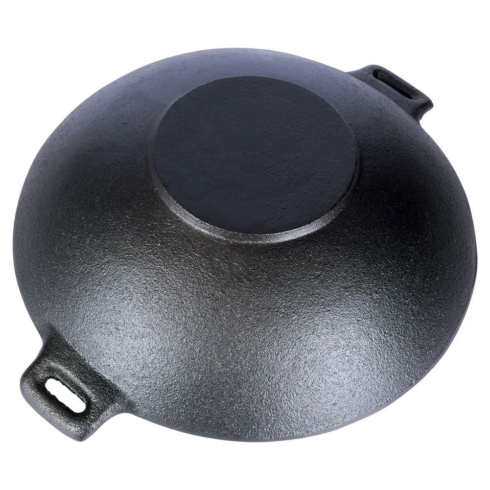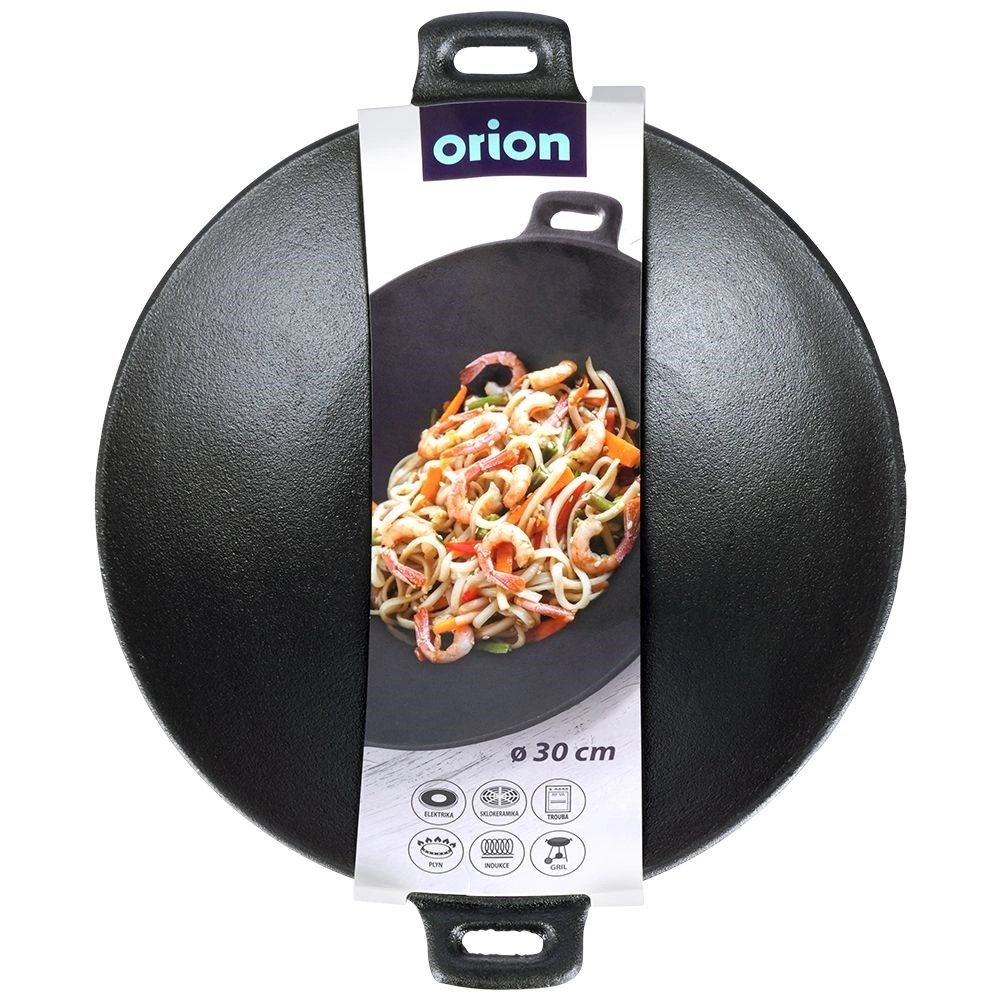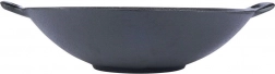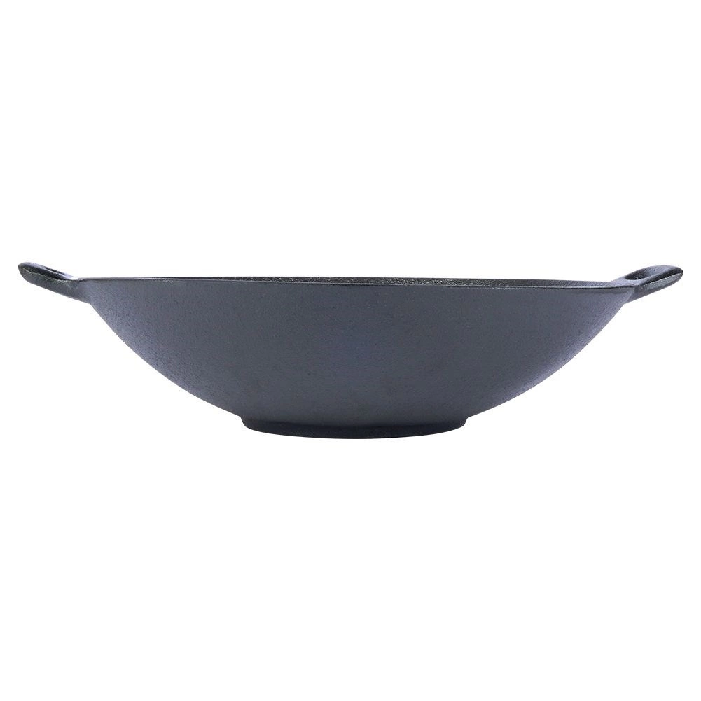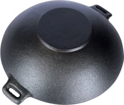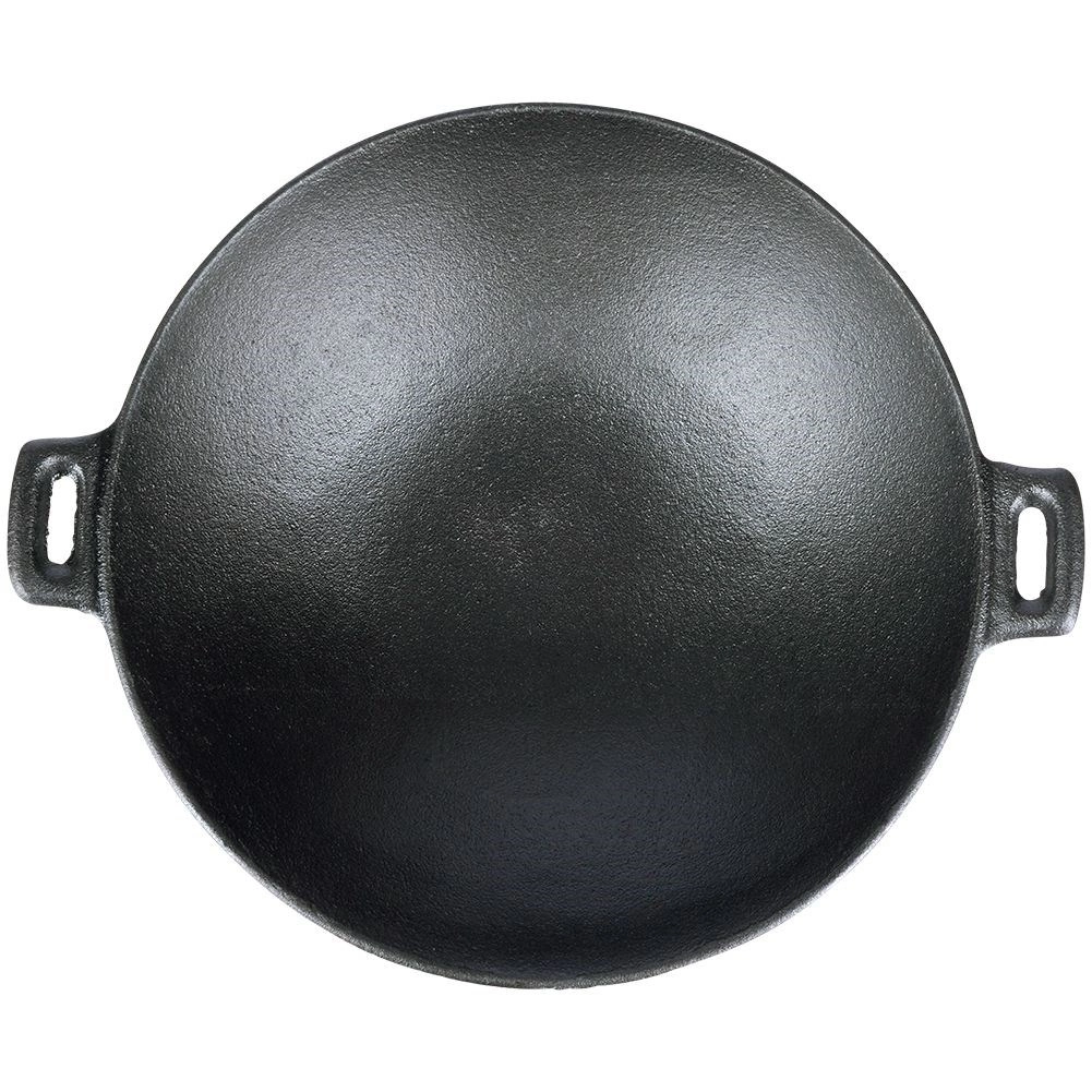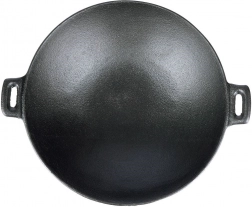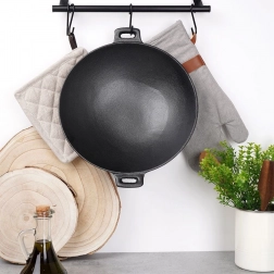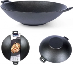 Univerzális, 30 cm átmérőjű öntöttvas wok két fogantyúval, ideális a gyors pirításhoz, a magas hőfokú sütéshez és a sütőben sütéshez. A masszív öntöttvas kialakítás kiválóan felhalmozza és egyenletesen elosztja a hőt, így tökéletes ropogósságot és szaftosságot érhetsz el. Alkalmas gáz-, elektromos-, üvegkerámia-, halogén és indukciós főzőfelületre is.
