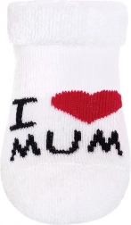 Ezek a fehér frottír babazoknik a minőségi kidolgozást, a kényelmet és a bájos dizájnt ötvözik I ♥ MUM / I ♥ DAD motívumokkal. A puha, meleg frottír anyag kíméletes az érzékeny bőrhöz, és a hűvösebb napokon is melegen tartja a lábakat.