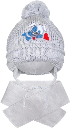 Ez a szürke téli sapka sállal ideális választás mindennapi viseletre a hideg időben. A kellemes kötött anyag és a kötött bélés kényelmet és melegséget biztosít, míg a megkötős zsinórok biztonságosan a helyén tartják a sapkát. A bájos kutyus minta és a pompon játékos megjelenést ad, amelyet a gyerekek imádni fognak.