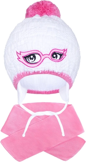 Meleg téli sapka gyerekeknek rózsaszín színben, összeillő sállal – ideális a hideg napokra. A kényelmes kötött bélés és az áll alatti megkötés gondoskodik róla, hogy a sapka tökéletesen tartson és védjen a hidegtől. A stílusos maszk-motívum és a pompon játékos megjelenést ad, amelyet a gyerekek imádni fognak.