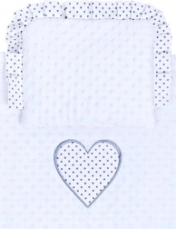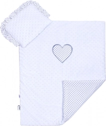 Az elegáns, fehér minky–pamut babakocsitakaró szett érzékeny bababőrre készült. A domború pöttyökkel ellátott minky felület melegen ölel és simogat, a teljes felületén pöttyös pamut oldal kellemes és jól szellőzik. A takarót nagy, pöttyös szívecske díszíti, a párnácskát finom fodor – szépen illik minden babakocsihoz és kiságyhoz.