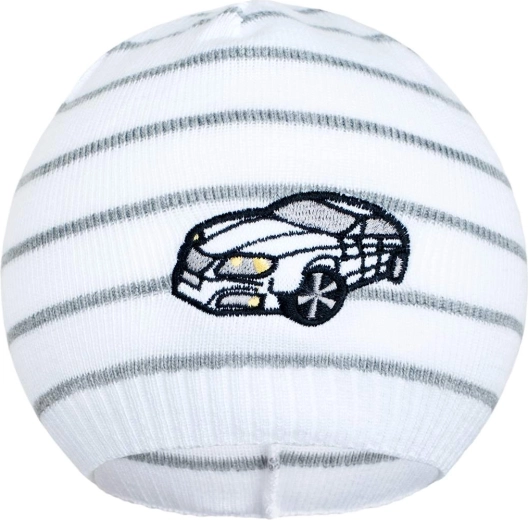 Ez a tavaszi New Baby sapka fehér–sötétszürke kivitelben bájos autós motívummal és modern csíkokkal nyűgöz le. A rugalmas pamutkötés kellemesen alkalmazkodik a gyermek fejéhez, és kényelmes viselést biztosít a hűvösebb reggeleken és a melegebb délutánokon is.
