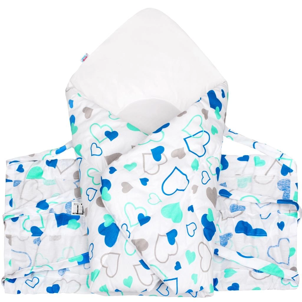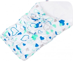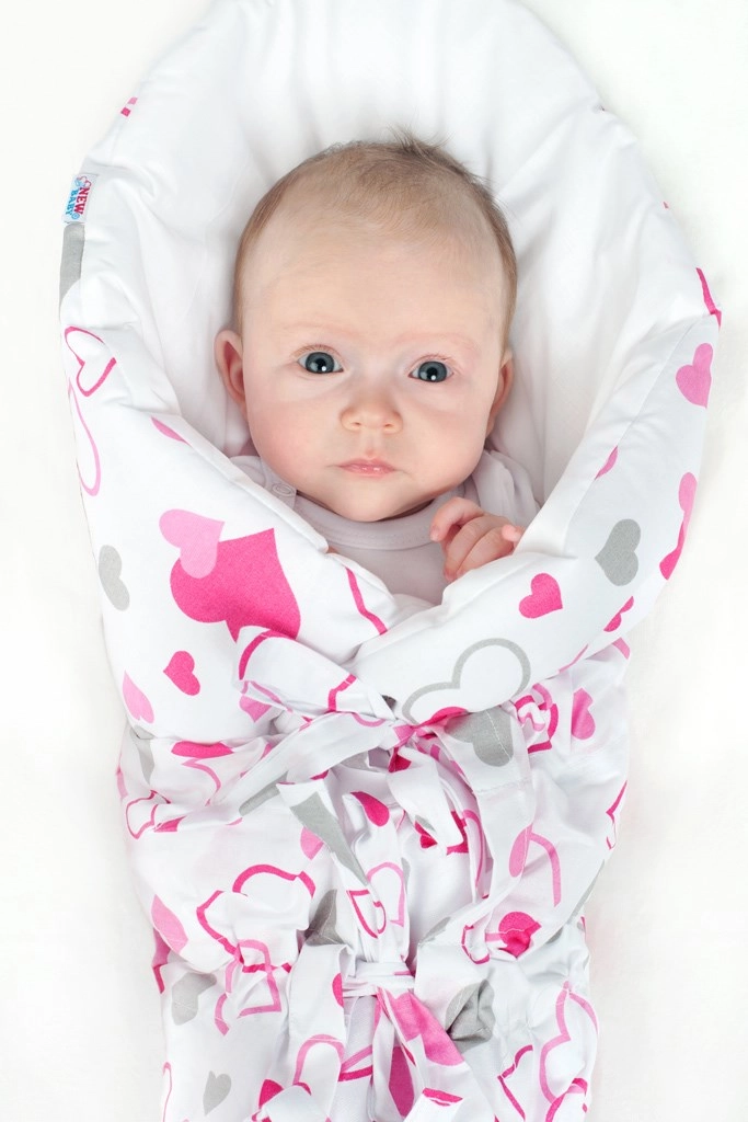 A New Baby kék szívecskés pólya kiváló választás a baba első heteire. A puha párnázás és a kapucni kellemes meleget ad és erősíti a biztonságérzetet. A három sorban vezetett fűzőszalagokkal a pólyázás a baba igényeihez igazítható.