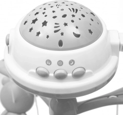 Az egyszerűen kezelhető gombokkal külön-külön kapcsolhatók a dallamok, a forgás és a vetítés. A csomagban levehető figurák találhatók, amelyek csörgőként használhatók, valamint egy színes órakorong forgatható mutatókkal az első felfedezésekhez. A zenegép 3 dallamot és természet hangját kínálja, a hangerő pedig állítható a zavartalan alvásért.