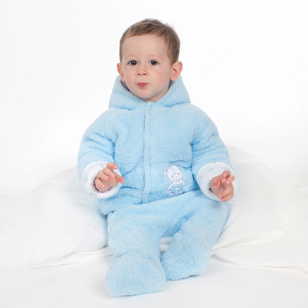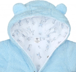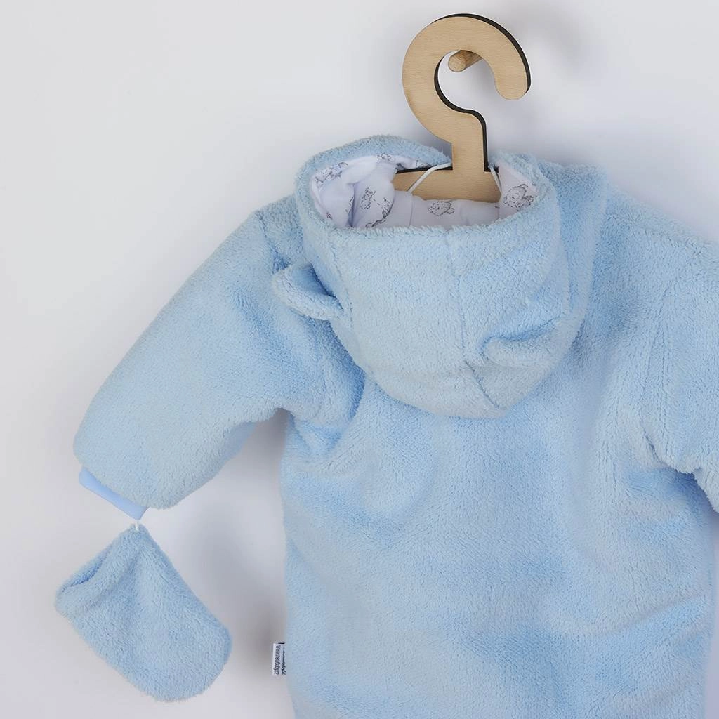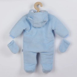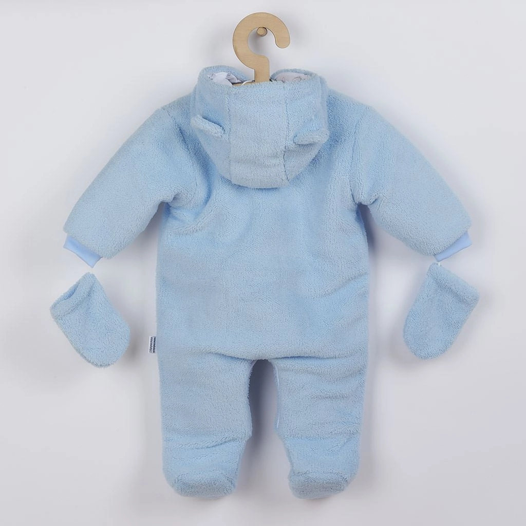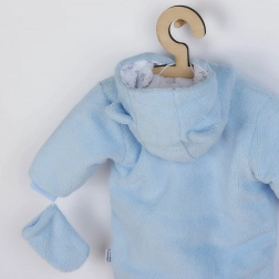 Meleg téli babaoverál kapucnival és aranyos fülecskékkel, amely meleget és kényelmet biztosít gyermekének még fagyos időben is. Kétrétegű kialakítás puha polár anyaggal, pamut béléssel és antiallergén töltettel a hideg ellen, míg a teljes hosszában patentos záródás megkönnyíti az öltöztetést. A csomag része a meleg, zsinóros kesztyű és a mackós díszítés is.