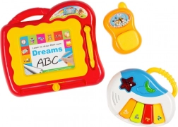 - mini zongora hangokkal és dallamokkal, fényhatások, levehető telefon, lapozható könyvecske, tükör, törölhető rajztábla, oldalsó játékok