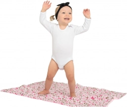 A New Baby gyerek takaró puha és meleg, a finom, 3D pöttyös minky a szenzoros stimulációért, valamint a lélegző, 100% pamut játékos mintával kombinálva. Kétoldalas, kíméletes az érzékeny bababőrhöz, hipoallergén, és ideális kiságyba, babakocsiba vagy utazáshoz.