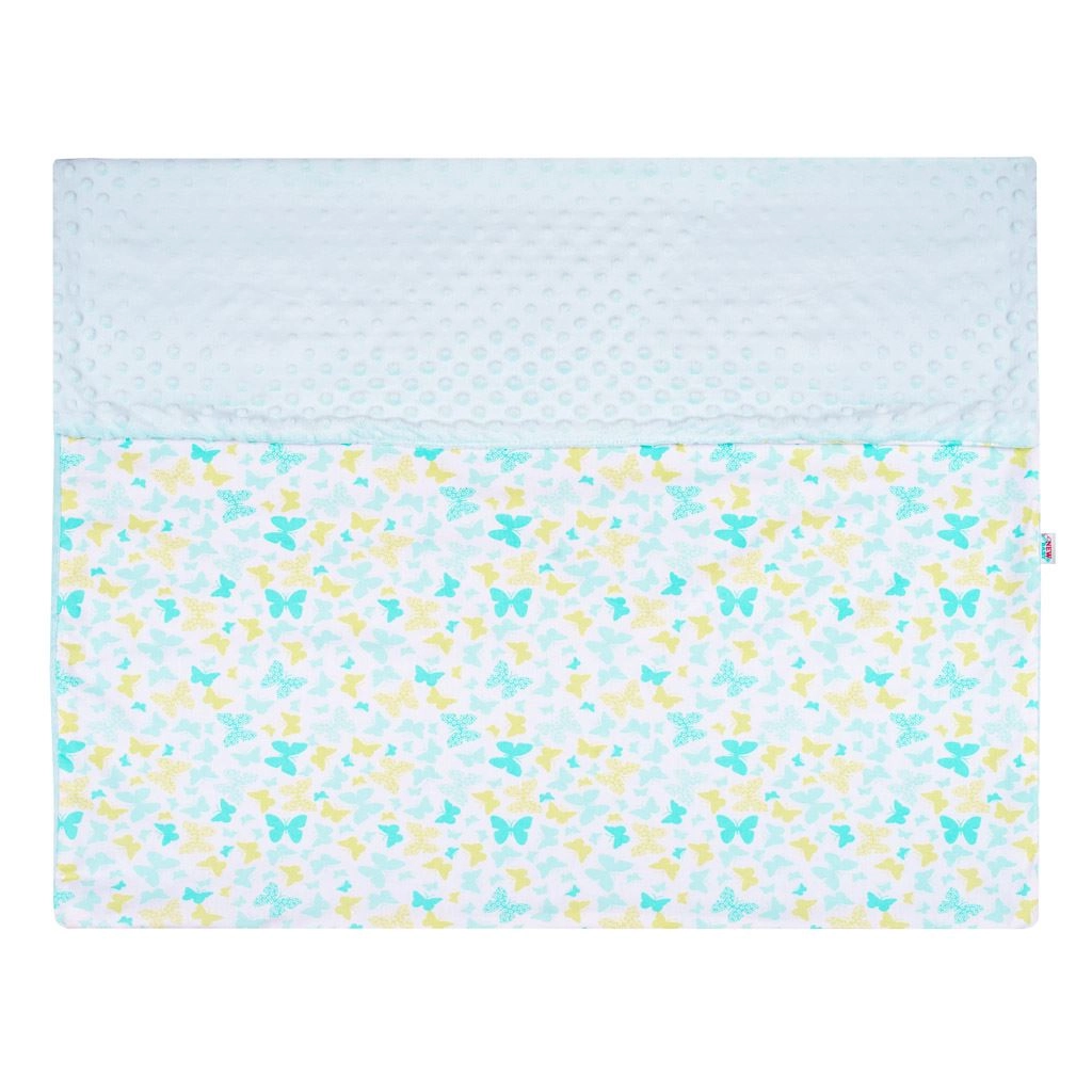 Ez a kétoldalas New Baby gyerek takaró a mindennapi használathoz egyesíti a kényelmet és a funkcionalitást. A halványkék minky oldal domború pöttyökkel taktilis stimulációt és otthonos meleget ad, míg a pamut, vidám mintás oldal légáteresztő és kíméletes a baba bőréhez.