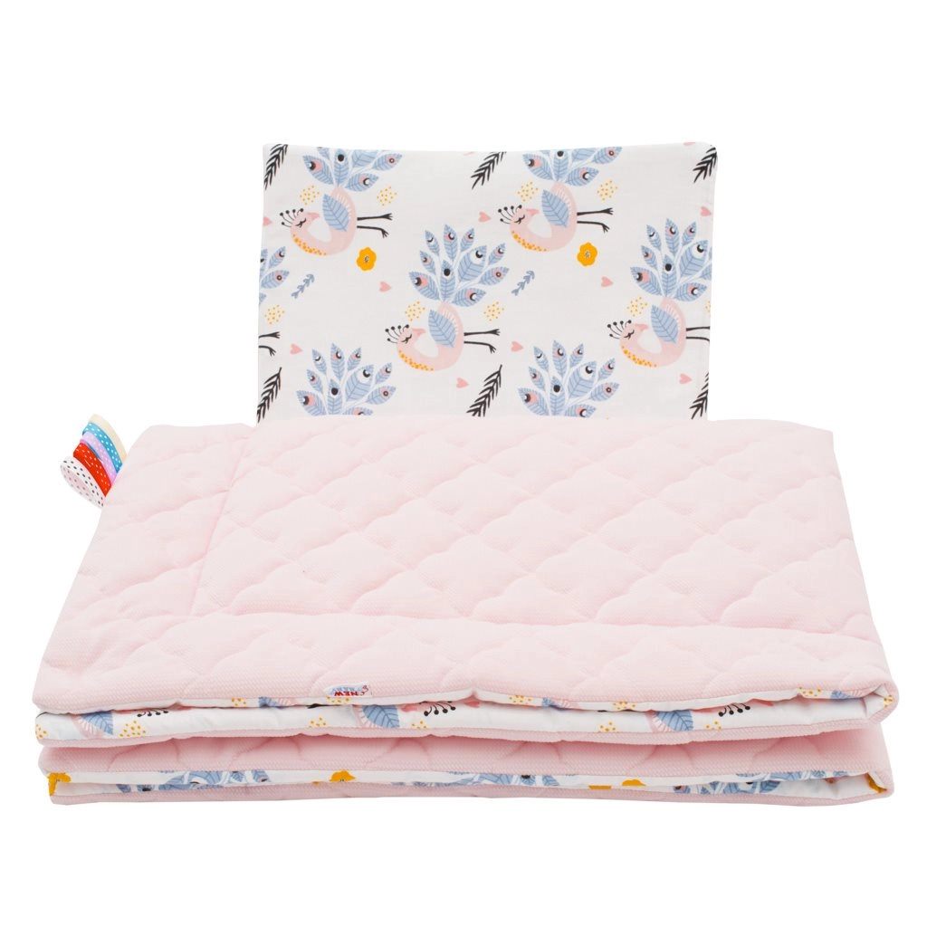 A cseh New Baby márka kétoldalas Velvet szettje ideális választás a baba kényelméhez otthon és útközben. Az egyik oldal lágy pamut megnyugtató pávamintával, a másik pihepuha Velvet, amely remekül melegít és tartja a formáját. A takarón lévő színes szalagok felkeltik a baba figyelmét és támogatják az érzékszervi fejlődést.