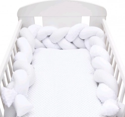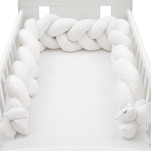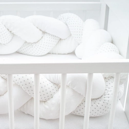 A fonott kiságyvédő copf modern és biztonságos alternatívája a hagyományos rácsvédőknek. Puha, vastagon párnázott kialakítása meghitt, védett környezetet teremt a kiságyban, megelőzve a rácsoknak ütközést és a fal felől érkező hideg beszivárgását. A semleges szürke, pöttyös minta könnyen kombinálható bármilyen ágyneművel.