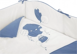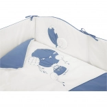 Megnyugtató kék–fehér színvilág és kedves motívumok teremtenek kellemes környezetet a babának.