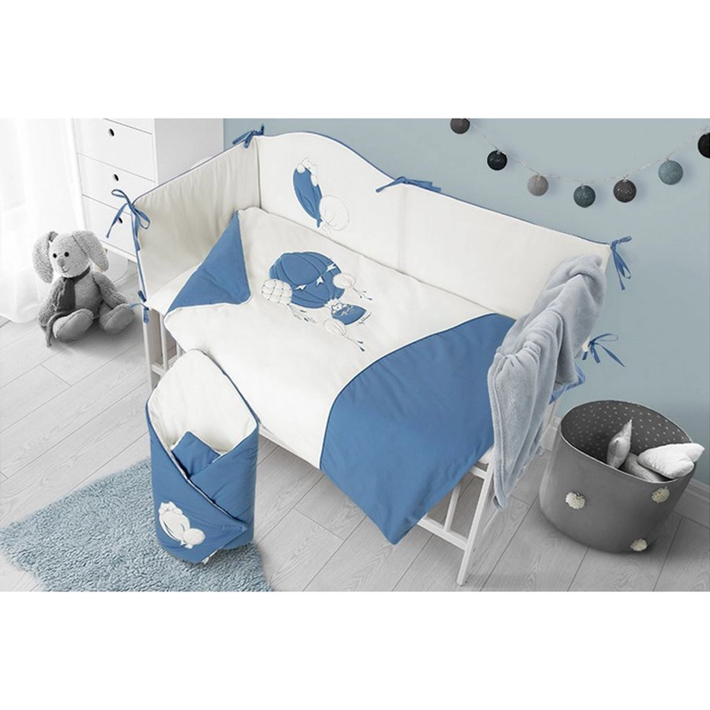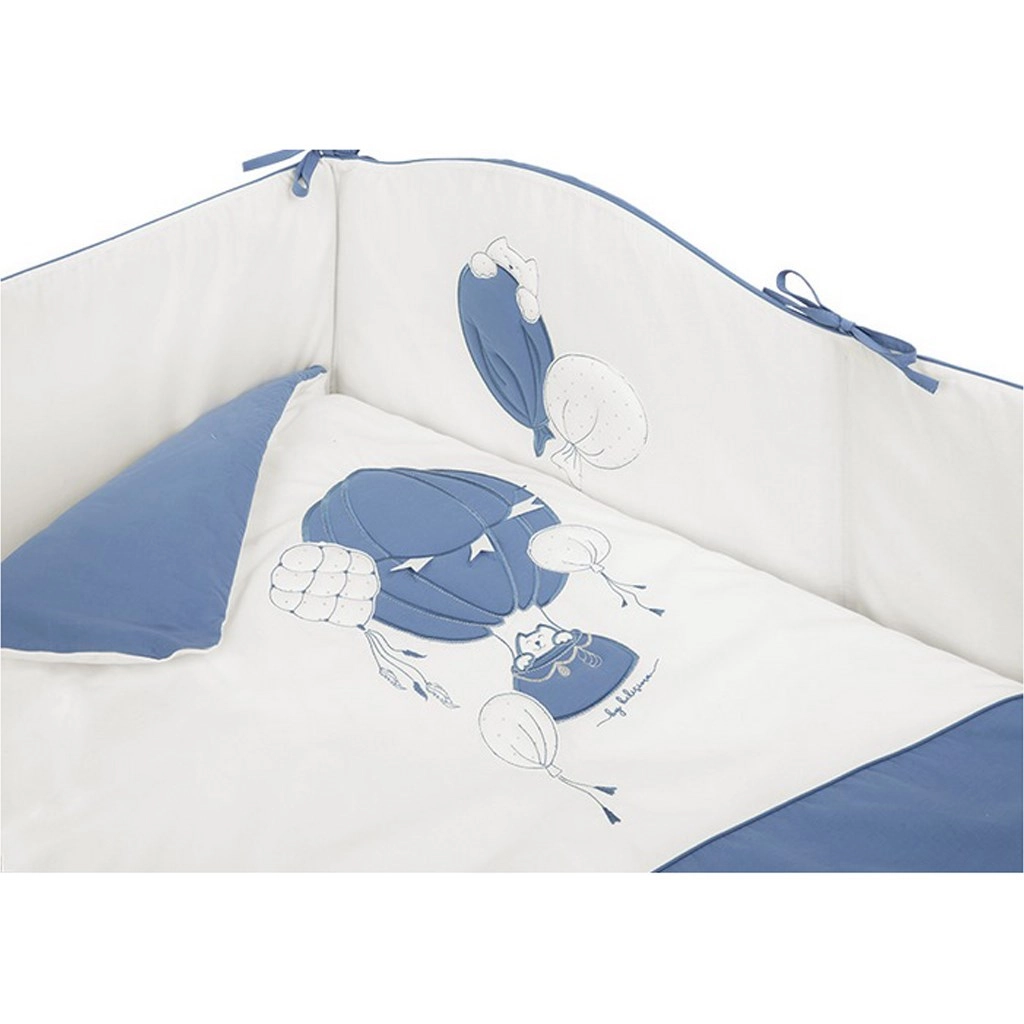 A BELISIMA Ballons kiságy szett stílusos kék–fehér kombinációja játékos léggömb mintákkal és lágy, megnyugtató színekkel hívja fel magára a figyelmet. A természetesen légáteresztő 100% pamut kellemes tapintású és kíméletes a baba érzékeny bőréhez.