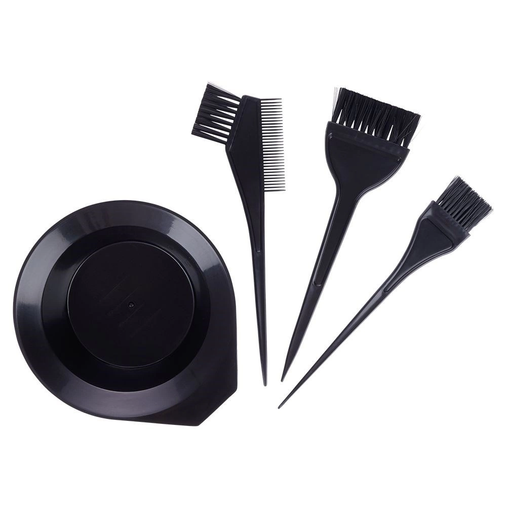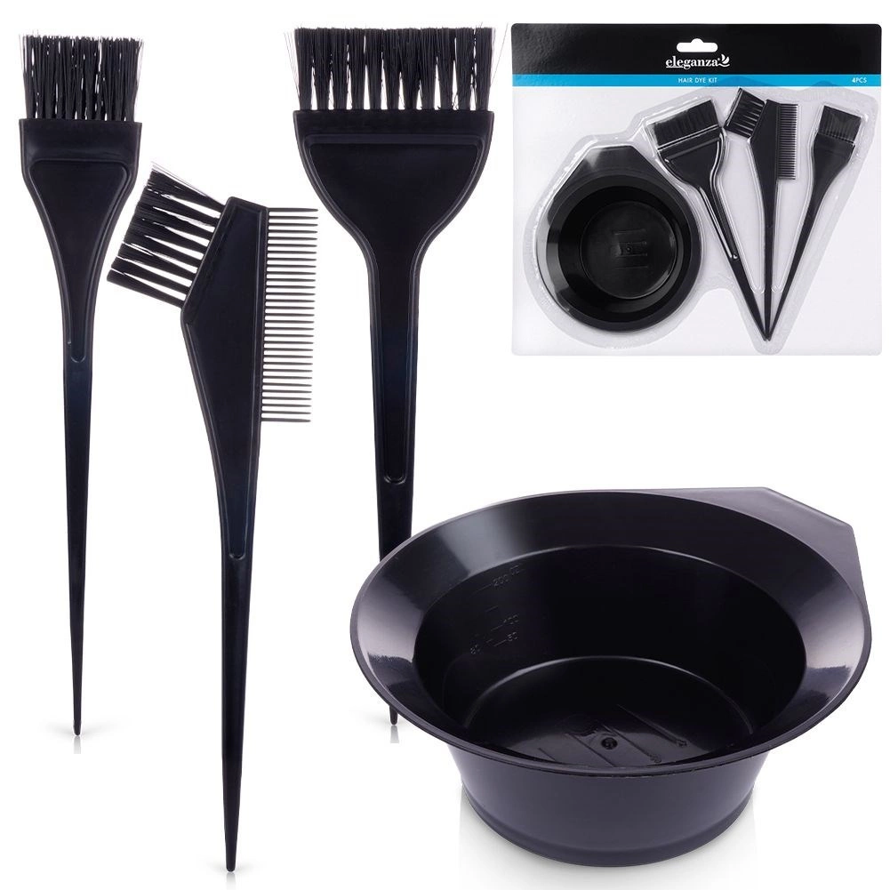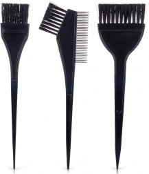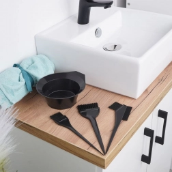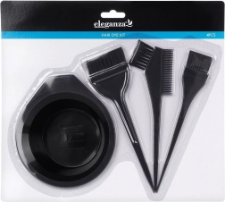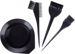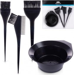 Teljes hajfestő készlet otthoni és professzionális használatra: mércével ellátott tál és három applikátor ecset, köztük fésűs ecset. Tartós műanyag kivitel, ellenáll a vegyszereknek, hegyes nyelű fogantyúk a tincsek pontos elválasztásához és többszöri használat a könnyű tisztításnak köszönhetően.