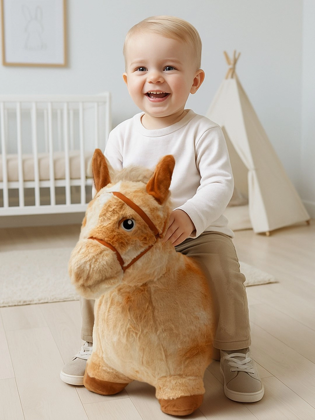 A PLAYTO plüss ugráló ló egyesíti a szórakozást, a mozgást és a biztonságot. A felfújható testet puha, kellemes plüss borítja, amely kényelmes fogást és stabilitást biztosít játék közben. A fülek megnyomására a ló élethű hangokat ad ki, ösztönözve a képzeletet és meghosszabbítva a játékidőt.
