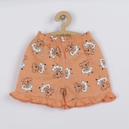 Aranyos nyári pizsama kislányoknak a New Baby cseh márkától, amely a 100% pamutnak és az átgondolt szabásnak köszönhetően maximális kényelmet nyújt. A szett egy rövid ujjú, fodros pólóból és finom mackómintás rövidnadrágból áll. A puha, rugalmas derékrész nem szorítja a pocakot, a pattentok a vállon pedig megkönnyítik az öltöztetést. Ideális meleg éjszakákra és nyári otthoni viseletnek is.