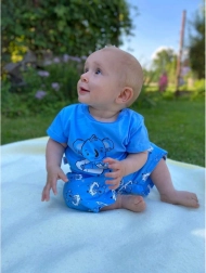 A pizsama 100% pamutból készült, amely légáteresztő, puha és kíméletes az érzékeny bababőrhöz. A széles, gumis derékrész gondoskodik róla, hogy a rövidnadrág jól tartson, ugyanakkor ne szorítson. Könnyű anyaga miatt a szett nemcsak éjszakára, hanem nyári otthoni viseletnek is kiváló.
