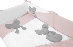 Ez az elegáns kiságyszett puha, pelyhes anyagokat és gyengéd dizájnt ötvöz, amely bármelyik gyerekszobába illik. A rózsaszín-fehér panelekhez szürke állatapplikációk társulnak, melyek megnyugtató légkört teremtenek és támogatják kisbabád nyugodt alvását.