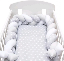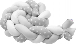 Stílusos és biztonságos fonott kiságyvédő a NEW BABY márkától, amely megóvja a babát a rácsoknak ütődéstől, és meghitt, nyugodt alvási környezetet teremt. A puha töltetnek és a minőségi 100% pamutnak köszönhetően kellemes tapintású, rugalmas, és könnyen igazodik bármely kiságyhoz. A semleges szürke–fehér csillagos dizájn minden gyerekszobába illik.