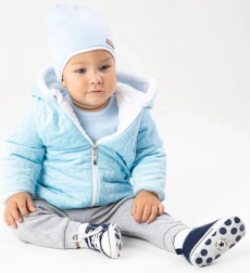 Stílusos és meleg szett babáknak hideg időre – kapucnis kabátka puha bársonyból és sapka pamutból. A kabát belül puha wellsoft béléssel készült a maximális melegért és kényelemért, praktikus, elöl végig futó cipzárral, hosszabbított hátrésszel és felhajtható ujjakkal a jobb hőtartás érdekében.