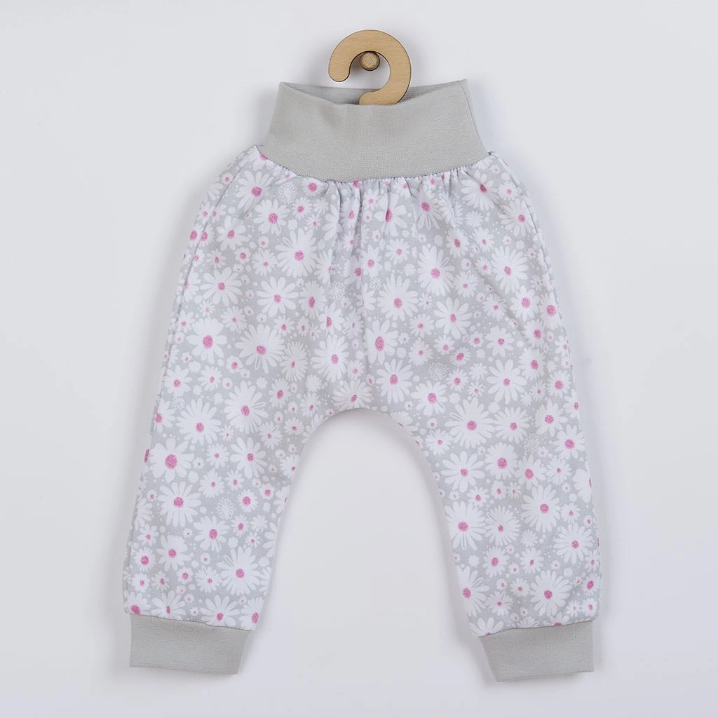 A melegítőnadrág teljes felületén virágmintás, széles, kényelmes derékrésszel és a szárakon szűkített passzéval, amely jól tart és nem szorít. A 100% pamutnak köszönhetően a szett légáteresztő, puha és kíméletes a baba érzékeny bőréhez.