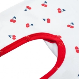 A vállakon és a lábak között található patentos záródás megkönnyíti az öltöztetést és a pelenkacserét. A cseresznye motívumos felvarró hátoldala alábélelt, hogy ne irritálja a bőrt. Az alsó rész teljes felületű cseresznyemintája játékos nyári megjelenést kölcsönöz a kislányoknak.