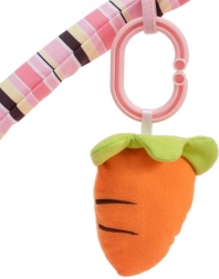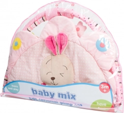 A Baby Mix nyuszis játszószőnyeg örömteli felfedezést kínál a színek, formák és hangok világában. A két keresztezett tornaív lógó játékokkal ösztönzi a fejemelést és a megfogást, így természetes módon erősíti a nyak- és hátizmokat. A levegős párnázás és a puha, velúros anyag kényelmes és biztonságos környezetet teremt játékhoz és pihenéshez.